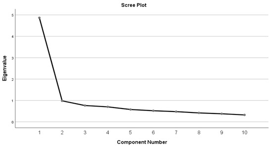 The exploratory factor analysis identified two main components with eigenvalues greater than 1, which together explained 58.49% of the total variance. The first component obtained an eigenvalue of 4.87, explaining 48.67% of the variance, while the second component presented an eigenvalue of 0.98, which added 9.81% of the explained variance (