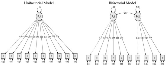 Figure 2 shows the path diagrams of both models. In the unifactorial model, a single latent factor explains all items (Items 1–10), with non-standardized factor loadings between 0.95 and 1.30. Although all loadings are substantial, the relatively high residual variances (between 0.70 and 1.35) suggest that there are aspects of some items that are not adequately captured by this model.
