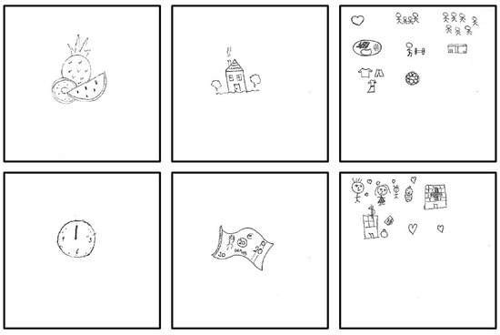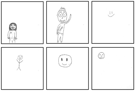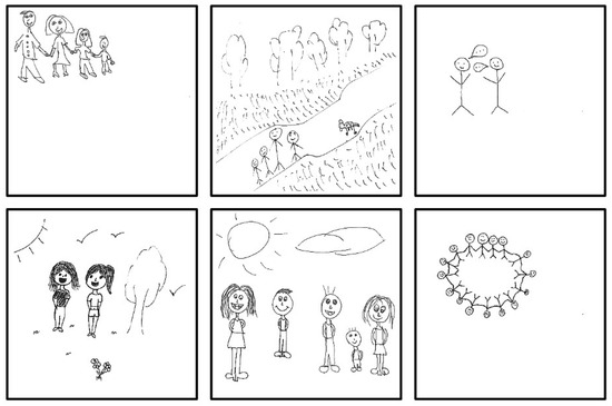 When the intention was to draw ‘family’ (n = 56), all the squares had at least two people. These varied according to simpler drawings including only faces and bodies, but the majority were more complex, including faces smiling in some scenarios (e.g., family at the table). When drawing people as ‘friends’ (n = 68), also at least two people were drawn. Some of these were holding hands, had smiley faces, and social interactions associated with them (e.g., balloons were sometimes drawn, and these were mostly balloons that represent talking). The squares characterized by the two previous factors (n = 72) showed that even though at least four people were drawn, a good portion of the drawings had a lot of people. Most of the people were smiling and most of the squares had other elements (e.g., a sun, a house, animals).