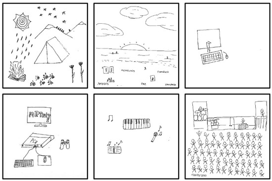 Images also highlighted the importance of hobbies through outdoor activities, technologies, music, and reading. This sort of activity was the second most illustrated theme. The images portraying hobbies showed the importance of self-selected activities to the perception of adolescent’s happiness [65], demonstrating the role of individuality and preferences in choosing a pleasurable activity. The ‘happiness as hobbies’ representations allowed an image to be created where adolescents picture themselves doing what they like in their free time, such as being engaged with nature, spending time on the computer, reading a book, or/and listening to music.