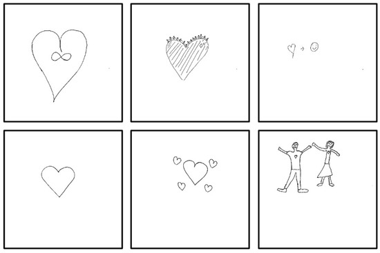 The ‘happiness as love’ concept was also a primary representation showing that adolescents attribute a fundamental role to love when imaging their happiness [12]. These particular images present evidence of the strong association between happiness and love in adolescents, with happiness being drawn as the concrete image of love—a heart.
