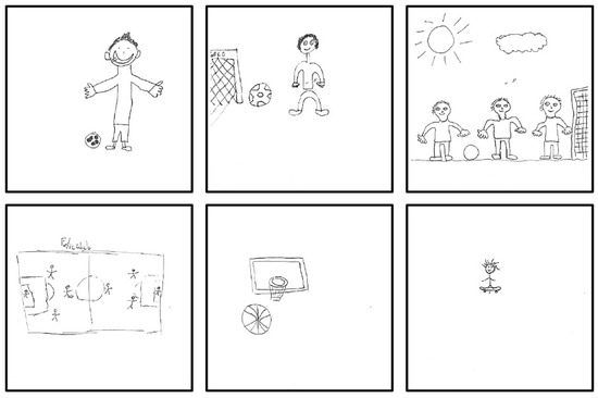 Happiness as sports (n = 44). In this theme, the focus was a person or a group of people performing a sportive activity—see Figure 5. Although the characteristics named in the themes ‘people’ and ‘smile’ were also presented, sports were given more emphasis. Soccer was the main sport drawn (n = 30). Most participants drew a group of two or three people with a ball on the ground, and some complexified the drawing with a scenario (e.g., sun, goal). Other sports were mentioned (n = 14) but usually only by one person (e.g., swimming, skating, cycling), except for basketball, which was characterized by two people.