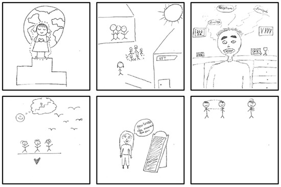 The prominence of sports, especially soccer, in the drawings showed its role in adolescents’ happiness for the Portuguese adolescents. The literature shows the positive effect of playing a sport, not only regarding physical and mental health but also in terms of developing specific social skills like leadership and communication [67]. A more recent study showed that positive attitudes towards sports directly and negatively correlate with loneliness in adolescence [67]. It appears that this positive influence of sports is perceived by this sample of adolescents, considering their favorite sport as an image of their happiness.