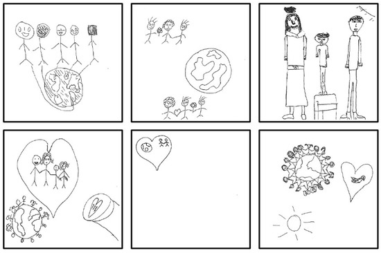 Happiness as love (n = 79). This theme included hearts drawn in the images—see Figure 4. Sometimes, only a simple heart was drawn, and other times the heart was accompanied by other hearts or elements (e.g., the Earth, sun, stars).