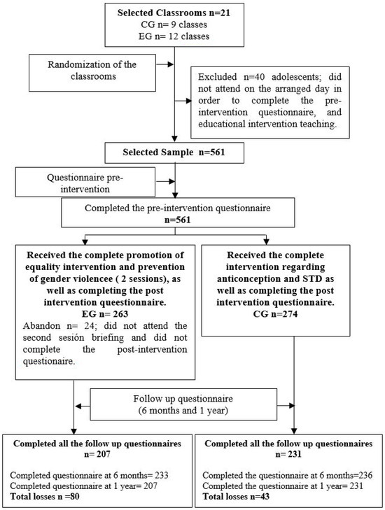 A total of 21 first-year Baccalaureate classrooms were selected and randomly assigned to the EG and CG. Forty adolescents were excluded as they did not attend on the agreed day to complete the pre-intervention questionnaire and the first session of the educational intervention. A total of 561 students were recruited for the study. Everyone completed the pre-intervention questionnaire. A total of 438 subjects (207 in the EG and 231 in the CG) attended all the educational sessions and completed all the post-intervention follow-up questionnaires. A total of 21.9% of participants dropped out of the study (Figure 1).