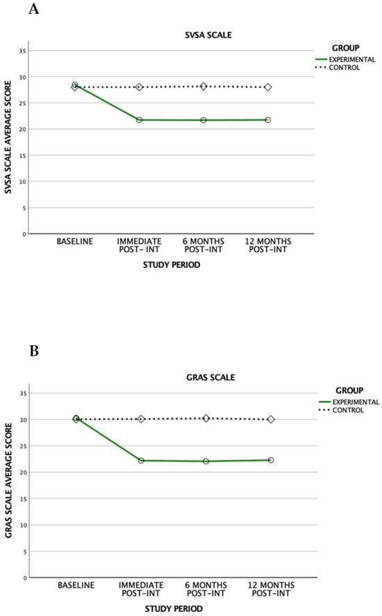 To evaluate the effectiveness of the educational intervention in the short, medium, and long term, a repeated measures analysis of variance was carried out for each of the dependent variables (SVSA and GRAS scales, and an assessment of the behavior of the female protagonist of the story), comparing the averages of the EG with the CG, at four time points (pre-intervention, post-intervention: immediate, 6 months, and one year) (Table 4, Figure 2 and Figure 3). We did not include in the analyses the assessment of the behavior of the male protagonist of the story due to the low variability, which we have referred to before.