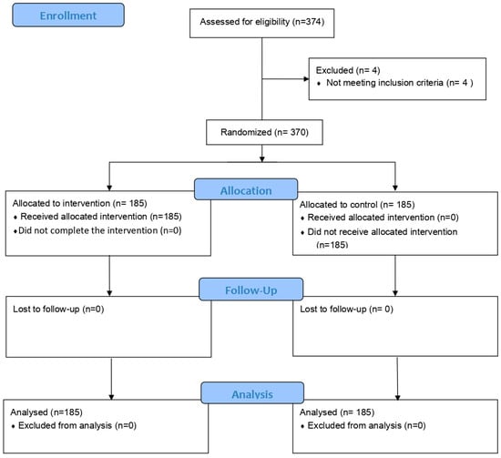 This randomized controlled trial was conducted in Khuzestan, Iran, in 2018. The study population consisted of 15–16-year-old female students (8th and 9th grade) in schools in Behbahan, Khuzestan province, Iran. This age group represents a critical developmental period for establishing Internet use patterns, and recent evidence suggests an increasing vulnerability to problematic Internet use among female adolescents in this cultural context []. The sample size was calculated to be 170 per group, considering a confidence level of 95% (α = 0.05) and a statistical power of 0.95, based on a similar study []. To account for a possible 10% dropout rate, 187 participants were initially enrolled in each group. A two-stage cluster random sampling approach was employed. First, four out of six eligible schools were randomly selected using a computer-generated randomization list. Second, these schools were assigned to either intervention or control groups (two schools per group) using simple randomization with a 1:1 allocation ratio from the same randomization list. To ensure allocation concealment, an independent individual not involved in the intervention conducted the randomization process. Participants were masked to their group assignment and only informed that they were participating in an educational study. Following allocation, all female students in grades 8 and 9 within the selected schools were screened, and those who met the inclusion criteria were enrolled in the study. Due to resource constraints, the same person delivered the intervention and enrolled participants. Baseline demographic characteristics were compared between groups to verify randomization adequacy.
