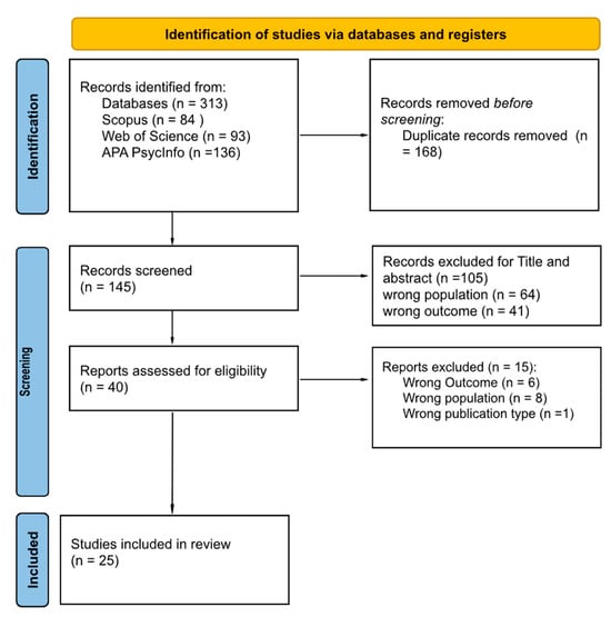 The initial database search identified a total of 313 records. Before screening the titles and abstracts, 168 records were removed because they were identified as duplicates through the Rayyan software. Subsequently, 145 were screened based on their title and abstract. A total of 64 records were excluded for the wrong population, and another 41 records were excluded for the wrong outcome, resulting in a total of 40 studies that were assessed for eligibility by reading the full texts. Thus, fifteen studies were excluded because they did not meet the inclusion criteria: six studies focused on the wrong outcome (i.e., TDV was analyzed as an antecedent/risk factor, not as an outcome), eight studies were excluded because the participants did not fall within the age range specified by the inclusion criteria, and one study was excluded for the wrong publication type (i.e., doctoral thesis). Ultimately, 25 studies met all the inclusion criteria and were included in the systematic review. The search results are shown in the PRISMA 2020 flow diagram (Figure 1).