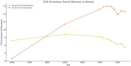 Trends in CO2 emissions per capita: Republic of Korea vs. Norway (1990–2022). Note: This figure includes data only from Korea and Norway due to data availability and the scope of the quantitative analysis.