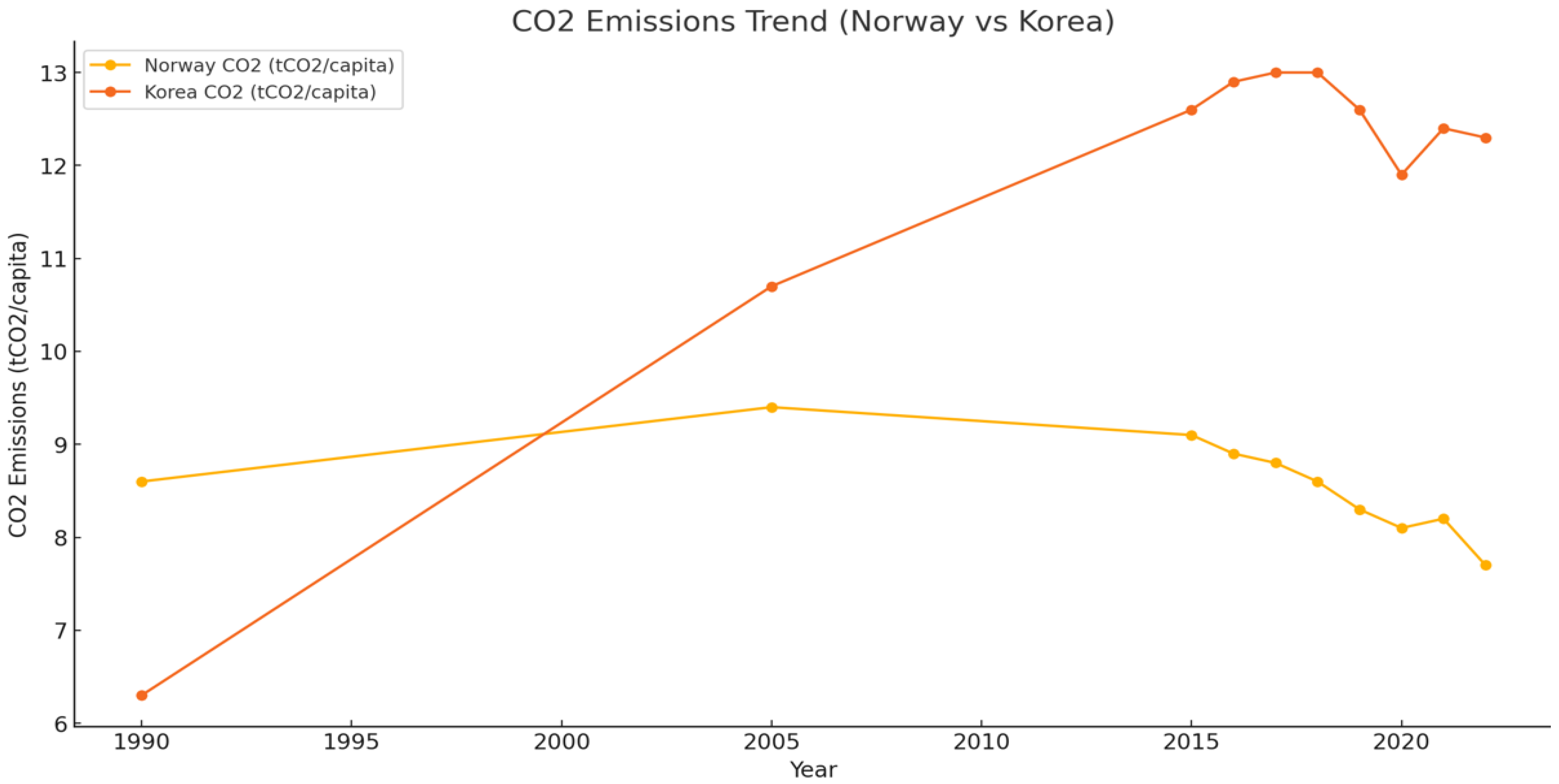 2 emissions between 1990 and 2022 for South Korea and Norway [