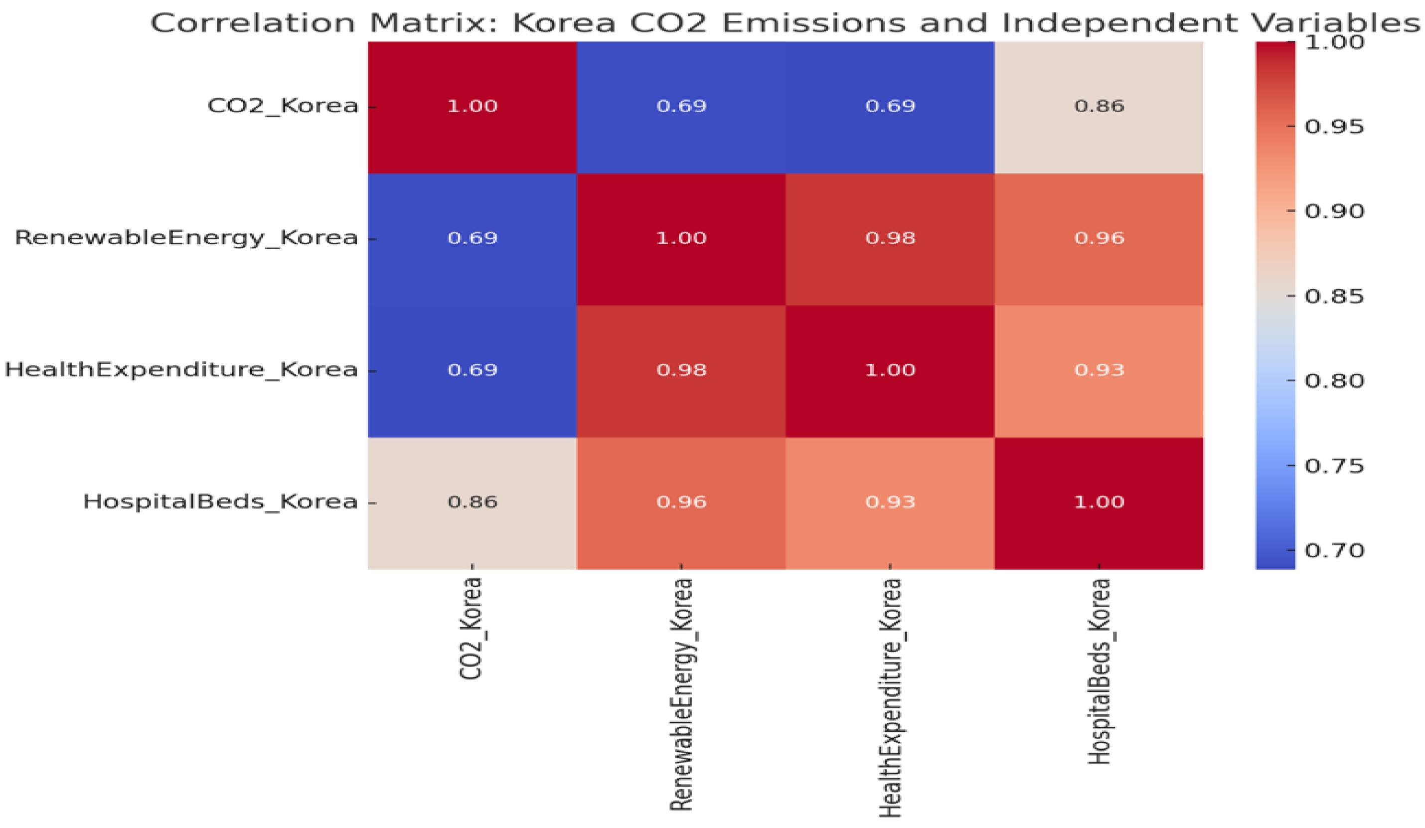2 emissions and key variables in South Korea, including renewable energy consumption by percentage of total final energy consumption, health expenditure per capita by current USD, hospital beds per 1000 people, renewable electricity output by percentage of total electricity output, and access to electricity by percentage of the population. The analysis indicated a strong positive correlation between the number of hospital beds and CO