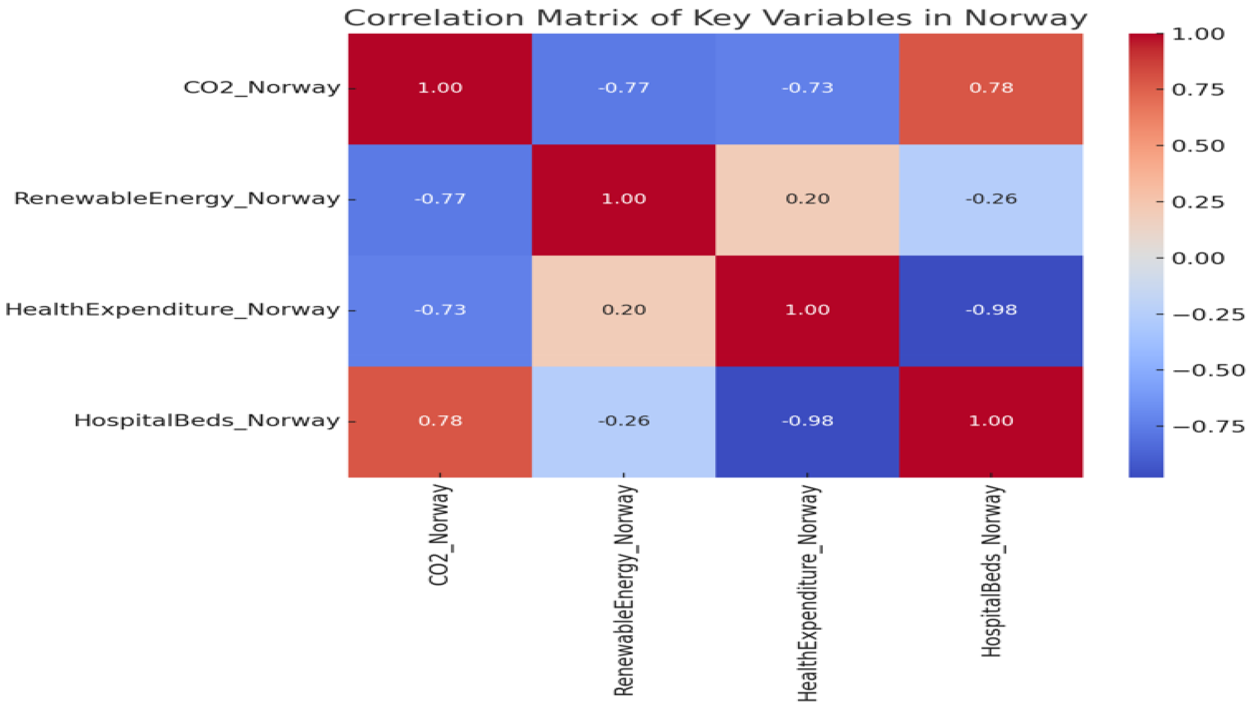 For quantitative analysis, open-access macro-level datasets on key indicators—including CO2 emissions, health expenditure, hospital beds, and renewable energy use—were retrieved from the World Bank database and subjected to descriptive, correlation, and regression analyses. Policy frameworks and case practices from Norway, and the Republic of Korea were comparatively summarized in structured tables and figures focusing on intervention design and implementation context. Country selection was restricted to Norway and Korea due to the availability of consistent open-access macro-level datasets and detailed institutional policy documents, and because these countries represent advanced healthcare systems with distinct governance approaches, providing meaningful grounds for comparative analysis. These cases provided sufficient depth for comparative synthesis, while other countries are referenced narratively where relevant but were not subjected to structured analysis.