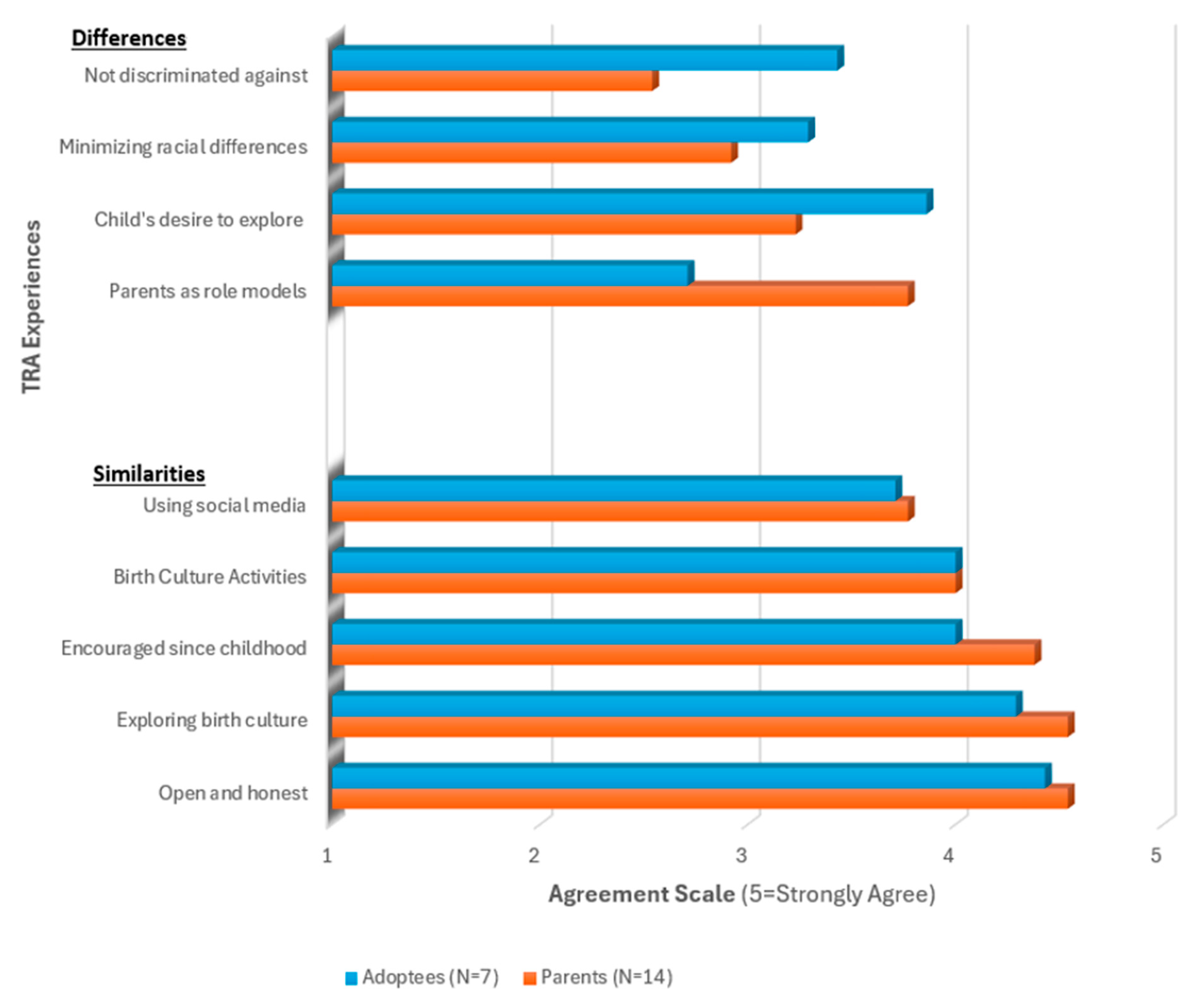 | I encouraged my child to participate in activities or organizations for their racial group. | 4.00 (0.82) | My parents encouraged me to participate in various cultural activities such as heritage tours, learning my birth language, or eating meals of my birth culture. | 4.00 (1.53) |
