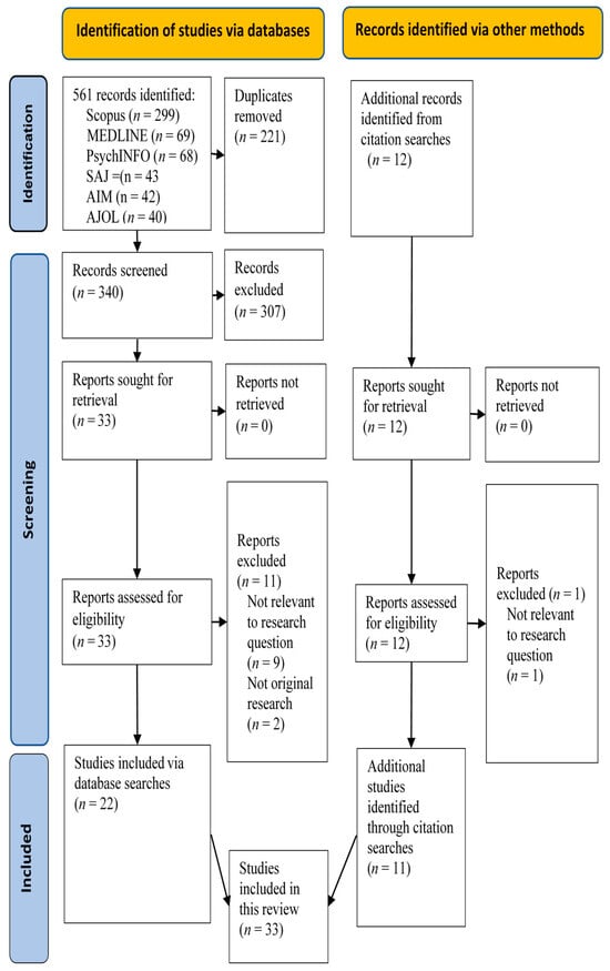 Inclusion criteria for this review were as follows: (a) original research studies that were published in peer-reviewed journals or presented in postgraduate theses/dissertations, (b) publication date being any date prior to 1 January 2025, (c) studies conducted on NSSI among adolescents aged 10 to 19 years and/or young adults aged 20 to 25 years (although studies that deviated by no more than two years either side of these age limits were included as long as such inclusion was not associated with significant changes in mean age scores), (d) studies that reported on self-harming behaviours that met this review’s definition of NSSI (i.e., deliberate self-harm to the surface of the body in the absence of suicidal intent), (e) studies conducted in African countries, (f) studies conducted in both African and non-African countries (as long as findings for African participants were reported separately), and (f) studies published in any language.