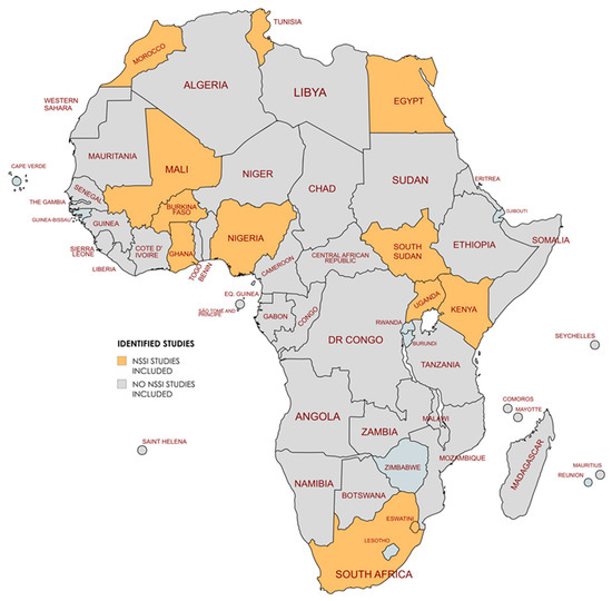 The data in Table 2 indicate that 33 studies were identified for this review, with these studies reporting on the experiences of 29,100 African adolescents and young adults. In terms of the World Bank classification of countries by income [96], 17 studies (51.5%) were conducted in one upper middle-income country (South Africa), 11 studies (33.3%) were conducted in lower middle-income countries (Egypt, Eswatini, Ghana, Kenya, Morocco, Nigeria, and Tunisia), and 5 studies (15.2%) were conducted in low-income countries (Burkina Faso, Mali, South Sudan, and Uganda). From Figure 2, it is evident that no studies were identified that reported on NSSI research conducted in the only high-income country in Africa (Seychelles), and no studies were identified that reported on NSSI research conducted in 42 out of 54 African countries.