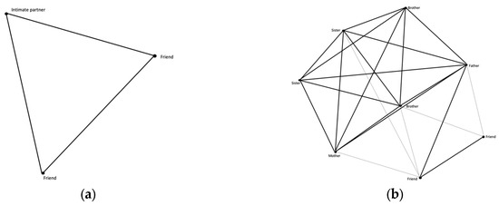 Network maps of unstably housed youth: (a) Network map with 3 members (Angel). (b) Network map with 8 members (Denise).