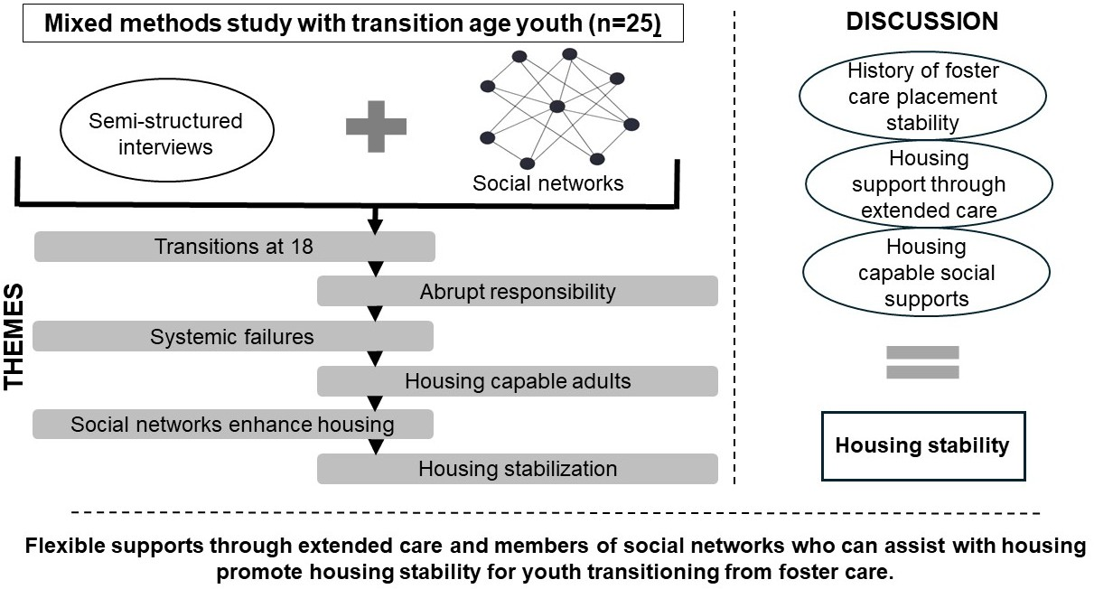 This study should be interpreted considering several limitations. First, the data were cross-sectional, capturing a snapshot of participants’ housing experiences that relied on retrospective recall rather than longitudinal prospective data. As a result, we cannot fully assess the durability of housing stability or instability over time. Second, the study was conducted in a single metropolitan region of Texas, which limits generalizability to other geographic contexts with different foster care policies, housing markets, or service landscapes. Third, the sample size was relatively small and does not fully capture the diversity of experiences among transition-age youth exiting care. Fourth, reliance on self-report introduces the possibility of recall bias or underreporting of sensitive experiences, such as homelessness, and may not accurately report child welfare experiences, such as the number of placements or years in care. Finally, our matrix analysis approach resulted in data reduction, and hence, there is a chance that we overlooked more nuanced dimensions of participant experiences. We attempted to guard against this, however, through our team-based inductive process. Despite these limitations, the mixed-methods approach, integration of social network mapping, and rich qualitative data provide valuable insights that advance understanding of the drivers of housing stability and instability among youth aging out of foster care.