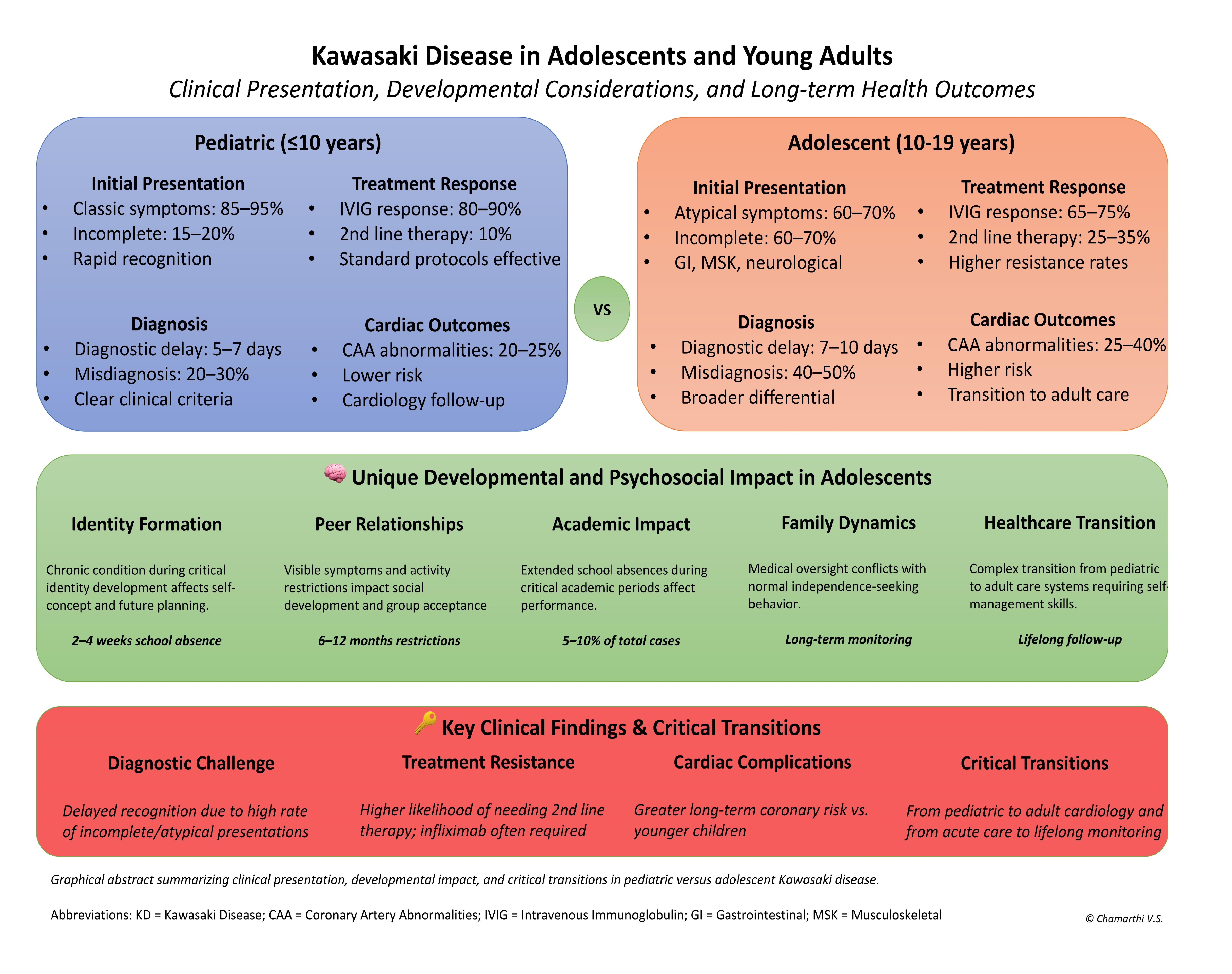 Adolescent Kawasaki disease is a distinct entity requiring specialized recognition, management, and long-term care. Compared with younger children, adolescents more often present with incomplete or atypical features, face delays in diagnosis, demonstrate higher rates of treatment resistance, and carry an elevated risk of coronary complications. These factors highlight the importance of heightened clinical awareness and careful consideration of developmental context when evaluating older patients. Beyond the acute phase, the illness affects not only physical health but also school performance, peer relationships, family dynamics, and identity development, making a comprehensive, developmentally informed approach essential.