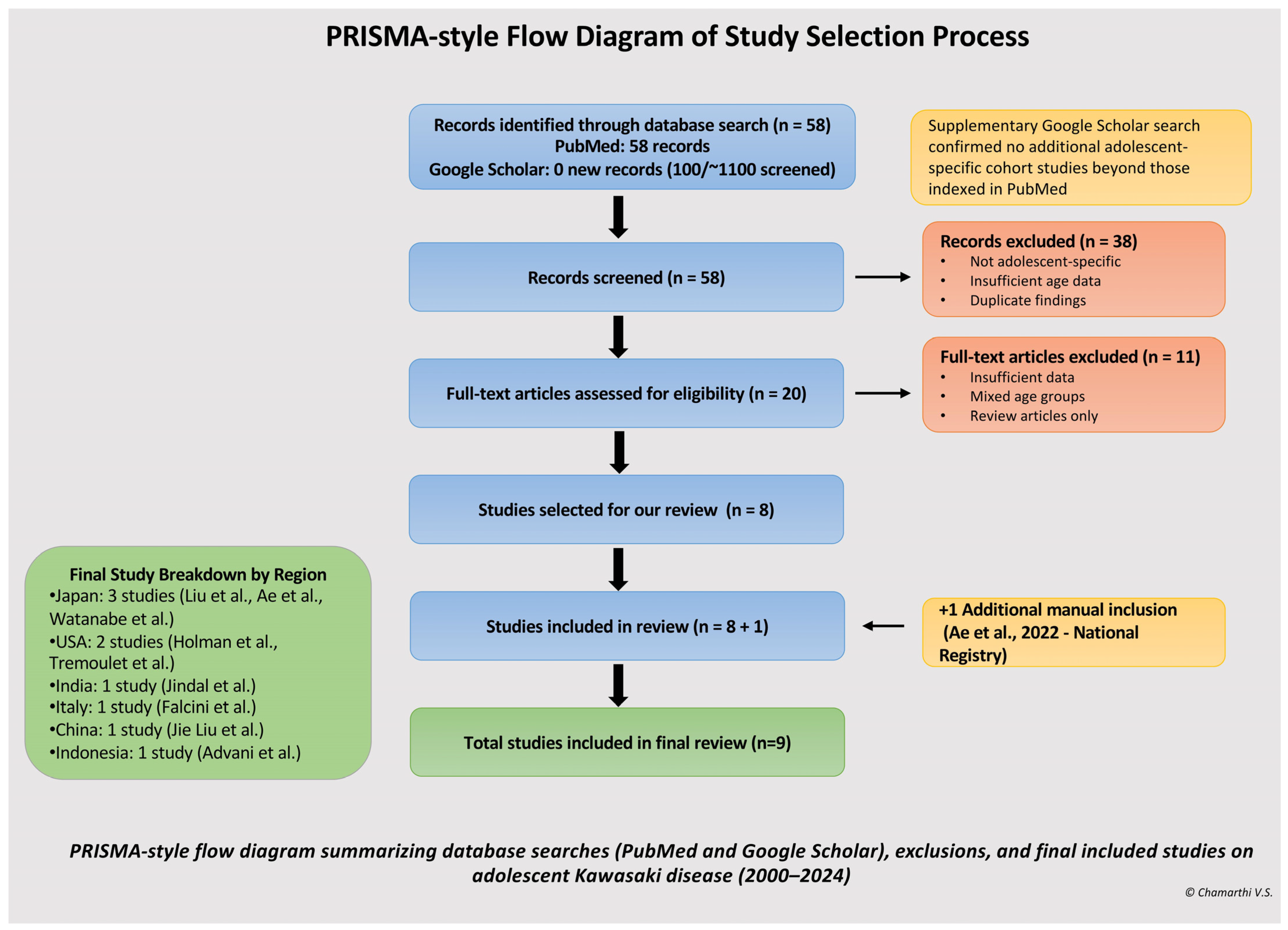 Two reviewers independently screened all titles and abstracts, followed by a full-text review. Discrepancies were resolved by discussion until consensus was reached. The search yielded 58 articles. Titles and abstracts were screened manually to identify studies reporting adolescent-specific data. After title and abstract screening, 20 full-text articles were reviewed, and eight studies were included in the final synthesis. An additional national surveillance study from Japan by Ae et al. was manually included due to its large cohort of adolescent KD cases and national significance, bringing the total to nine studies [
