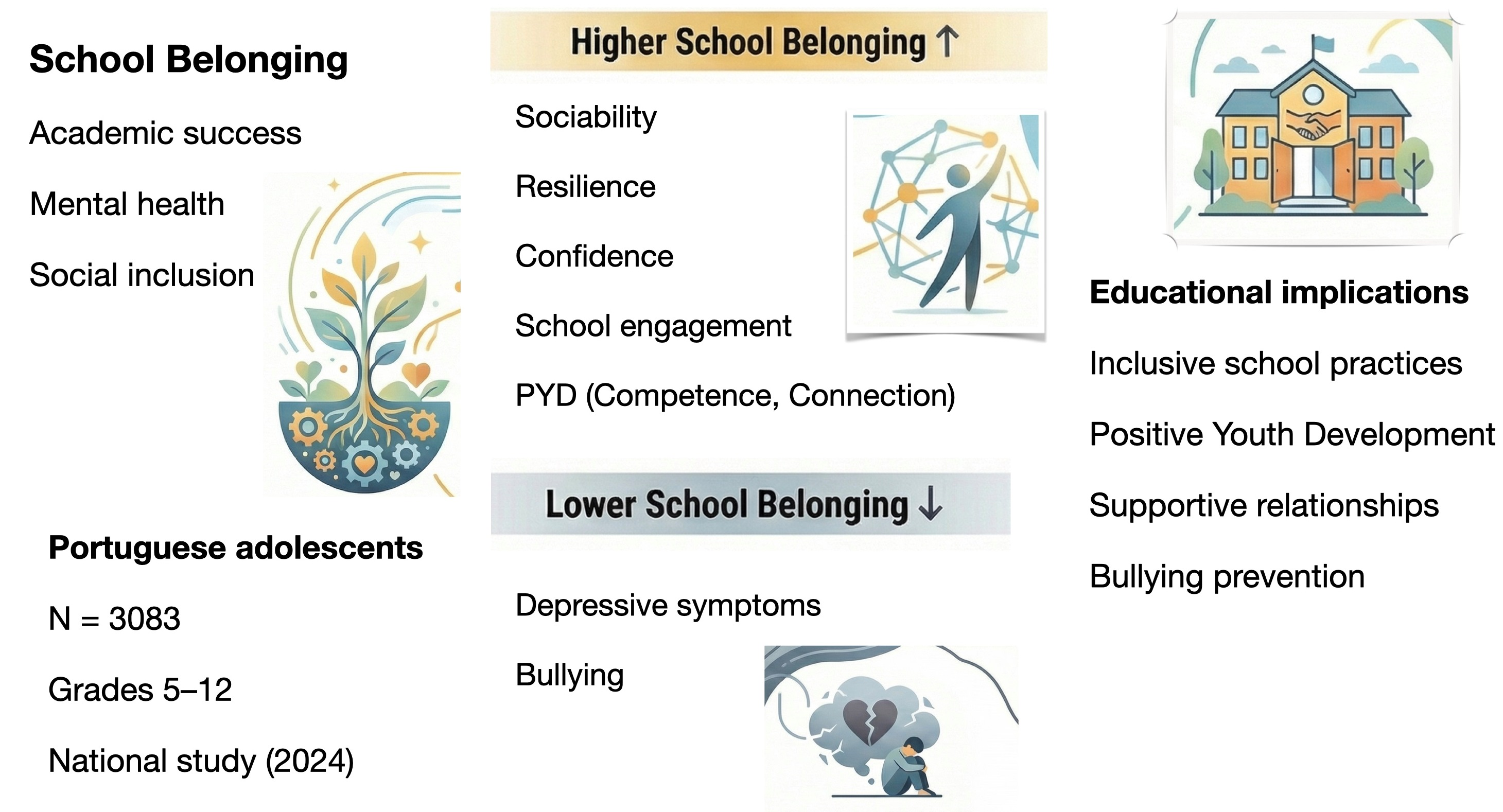 5]. Conversely, weak belonging is associated with disengagement, loneliness, emotional difficulties, and higher risk of school dropout [