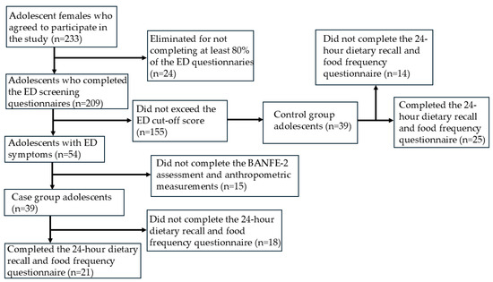 The inclusion criteria for this study were as follows: (a) being female and (b) exceeding the cut-off point in the ED screening questionnaires. Initially, 54 participants met these criteria, but 15 dropped out after the first stage, leaving 39 adolescents with symptoms. A comparison group of 39 asymptomatic females was then randomly selected, ensuring they did not exceed the cutoff on any ED screening questionnaire (see Figure 1). The characteristics of the sample are shown in Table 1.