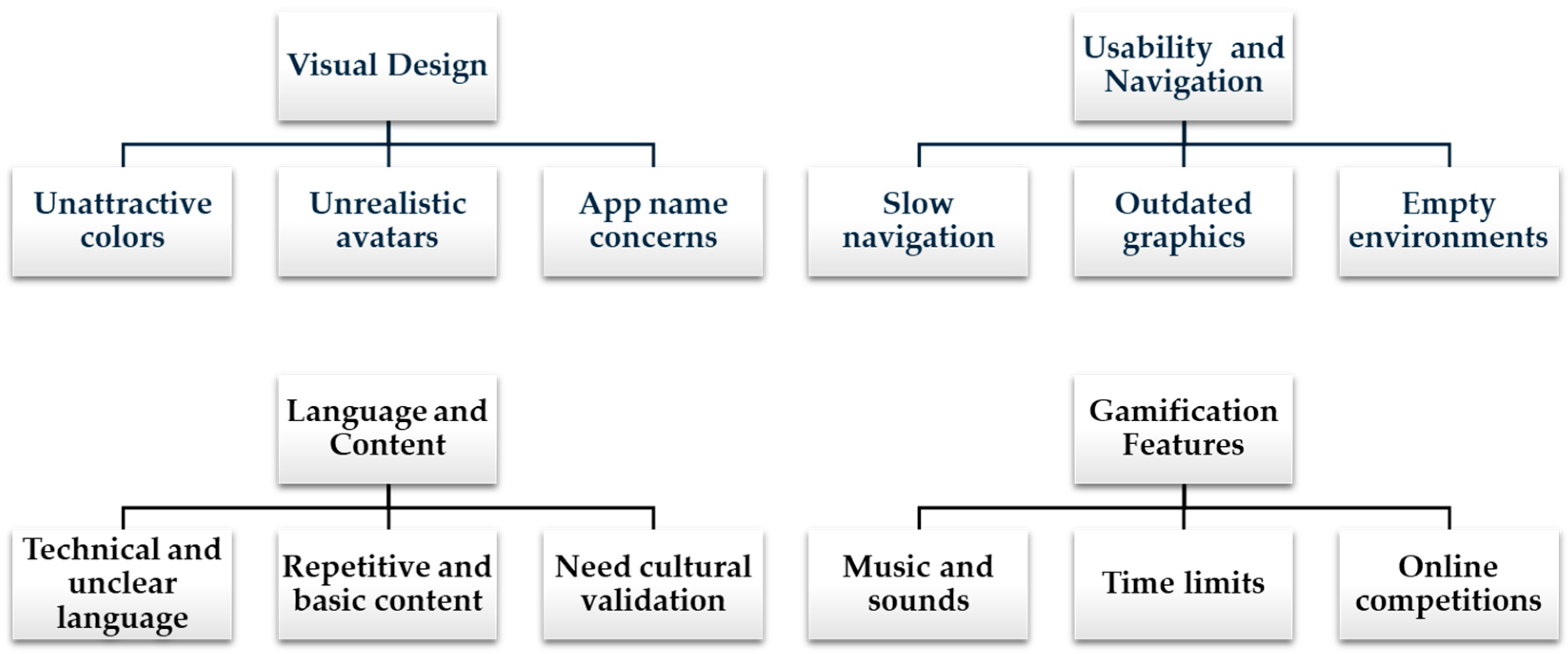 | Visual Design | Compared app to commercial games; requested more attractive graphics, dynamic environments, and avatar personalization. | Highlighted clarity and coherence; noted unrealistic or childish avatars. | Improve overall visual appeal and strengthen interface and avatar design. |