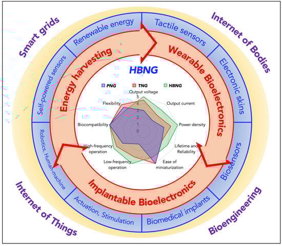 Illustrations of the potential applications of hybrid bio-nanogenerators (HBNGs). The radar chart in the center shows qualitatively the properties of piezoelectric nanogenerators (PNGs), triboelectric nanogenerators (TNGs) and hybrid bio-nanogenerators (HBNGs): flexibility, output voltage, output current, output power density, lifetime and reliability, ease of miniaturization, low-frequency operation, high-frequency operation, biocompatibility. The surrounding scheme shows the most usual fields of applications for HBNGs, i.e., energy harvesting, wearable bioelectronics and implantable bioelectronics, with some specific examples: tactile sensors, electronic skins, biosensors, biomedical implants, actuation, stimulation, robotics, human-machine interfaces, self-powered sensors and renewable energy sources. The words outside the circle indicate the main technological contexts for the aforementioned applications: smart grids and cities, Internet of Things (IoT), Internet of Bodies (IoB) and Bioengineering.