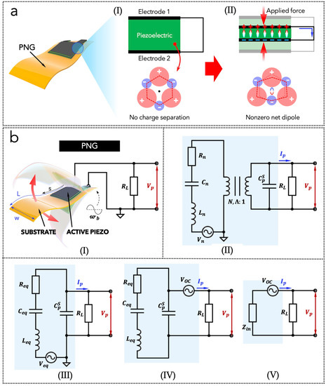 (a) Piezoelectric mechanism: (I) unloaded state and no charge separation; (II) loaded state with an applied force or strain and a non-zero net electrical dipole. (b(I–V)) Equivalent circuit model of a PNG. (I) PNG connected to a resistive load () and subjected to a base excitation (). (II–IV) Full equivalent circuit model and simplified versions. (V) Final equivalent circuit model of a PNG, consisting of an internal impedance () and an alternate voltage source ().