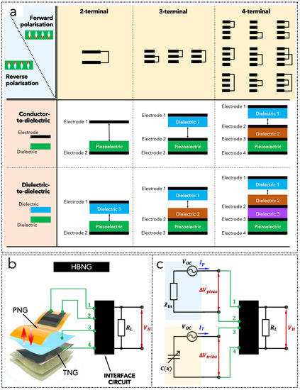 Han et al. [155] have investigated and compared (theoretically and experimentally) different piezoelectric-triboelectric nanogenerators, taking into account the number of terminals and contacted materials, the polarization direction and electrode connection (Figure 4a). They classified six different configurations (three in conductor-to-dielectric mode and three in dielectric-to-dielectric mode), as well as one, three and nine possible configurations for two-terminal, three-terminal and four-terminal devices, respectively. Additionally, for each configuration, two possibilities can be distinguished with forward or reverse polarization of the piezoelectric material. Thus, 52 configurations have been considered in total. In general, if is the number of terminals, the following formula can be proposed for the number of possible configurations: