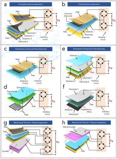 (a,b) Classification of intra-domain hybridization with complete (a) or partial (b) physical separation. (b–f) Classification of intra-domain hybridization with physical integration, as Triboelectric Enhanced Piezoelectricity, TeP (c,d) and Piezoelectric-Enhanced Triboelectricity, PeT, (e,f). The classification is based on the surface micro-/nano-patterning of the triboelectric (c) or piezoelectric (d) layer, on the interposition of piezoelectric between triboelectric layers (e), or on the incorporation of piezoelectric fillers into a triboelectric layer. (g,h) Classification of inter-domain hybridization with (g) physical separation or (h) physical integration, using as example a piezoelectric-triboelectric-pyroelectric nanogenerator.