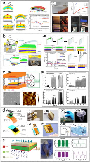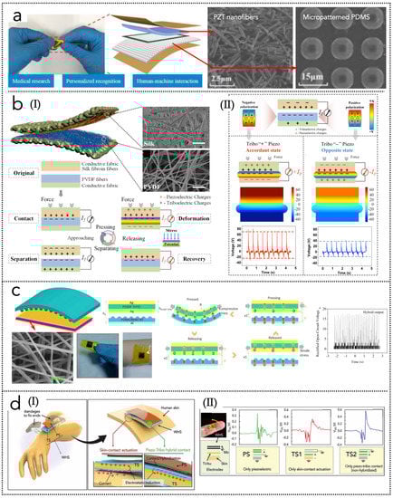 Yu et al. [153] reported on a tactile PeT-HBNG based on a PZT-PDMS composite film (Figure 7a), demonstrating enhancements in terms of sensitivity, good skin-conformality, good linearity, fast response and high stability. To avoid the use of PZT, a similar PeT-HBNG was presented by Guo et al. [163]: the device is based on electrospun silk fibroin and PVDF nanofibers, exhibiting high energy harvesting capability, good air permeability, possibility of identifying various types of body motion. Figure 7b(I,II) shows the structure and materials of the HBNG, its working principle and the simulated/experimental piezo-triboelectric interaction effects in accordant and opposite state (depending on the piezoelectric polarization). Wang et al. [150] proposed a flexible wearable HBNG made of P(VDF-TrFE) electrospun nanofibers and multiwall carbon nanotubes (MWCNT)-doped PDMS composite membrane (Figure 7c). The device exhibits, as a power source, a peak-to-peak voltage and power density, respectively, of 25 V, 1.98 mW/cm3 for PNG, and 2.5 V, 0.689 mW/cm3 for TNG. Electrospinning is a useful technology to produce films of piezoelectric materials without the need of electrical poling, even though the process parameters are characterized by a wide variability.