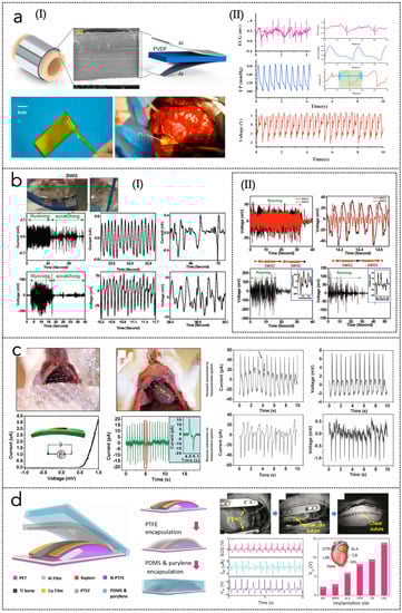 HBNGs are still not massively adopted for implantable applications but the use of PNGs and TNGs as implants has been recently explored [265,266,267,268,269]. However, the friction effects with the surrounding tissues are always present due to the sliding movements of the devices, thus the resulting signal produced by the system can be a combination with triboelectric signals, therefore an internal hybridization is possible to occur. Dagdeviren et al. [270] reported on biocompatible, flexible PZT-based energy harvesters monolithically integrated with rectifiers and millimeter-scale batteries for simultaneous power generation and storage, including high-power, multilayer designs. The devices are evaluated in live animal models, on various locations/orientations on different internal organs (heart, lung, diaphragm), as well as inside the body of a bovine model through thoracotomy experiments. Output voltages of ∼4 V, ∼4 V, and ∼2 V, respectively, can be generated from contraction and relaxation of the right ventriculus, lung, and diaphragm, whereas a stack of five devices can harvest 1.2 µW/cm2 power density. The same authors [271] presented ultrathin, stretchable networks of mechanical actuators (seven) and sensors (six) constructed with PZT nanoribbons, that allows for in vivo measurements of viscoelasticity in the near-surface regions of the epidermis as well as on ex vivo freshly explanted, unpreserved bovine organs (heart and lung). Zhang et al. [272] fabricated a PNG based on 200 µm-thick Al/PVDF wrapped around the ascending aorta of a pig, for harvesting energy from the variations in diameter of the carotid artery between the systolic and diastolic states (Figure 8a(I,II)). The resulting peak output voltage is 1.5 V at a heart rate and blood pressure of 120 bpm and 160/105 mmHg, respectively.