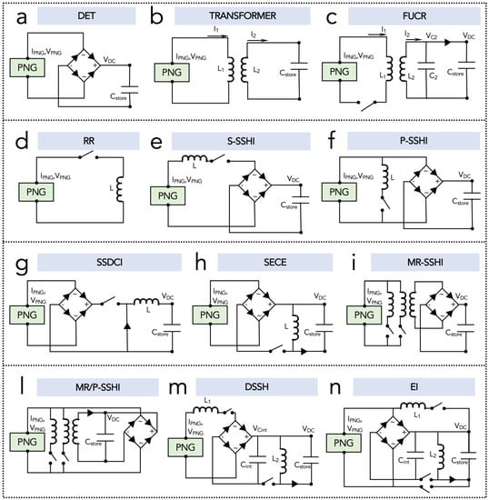 The analytical model takes into account only a resistive load connected to the PNG and the maximum output power consumption on the load is yielded by the optimal load resistance [101]. Accordingly, a load resistor is usually taken into account for during the transducer design and optimisation stage. However, this approach is not exhaustive, in fact, the circuit downstream of the PNG is often more complex in order to transfer efficiently the power to an energy storage, as discussed in [104]. On the other hand, the approach of electromechanical analogy, i.e., between electrical and mechanical domains, is a useful tool for solving this issue. Each element in the mechanical motion of the PNG may be translated to a homologous electric counterpart, therefore the PNG can be replaced by its equivalent circuit model (ECM) [100,101,102].