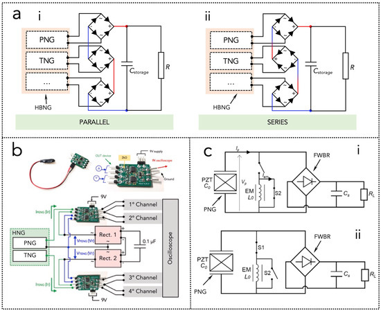 HBNGs can be considered multi-source, multi-function and multi-mechanism devices. In this section, the hybridization of PNGs and TNGs is taken into consideration. Depending on the way these two components are connected and coupled, different structural schemes can be distinguished, and the circuit model and the power management circuits necessary to extract signals are different.