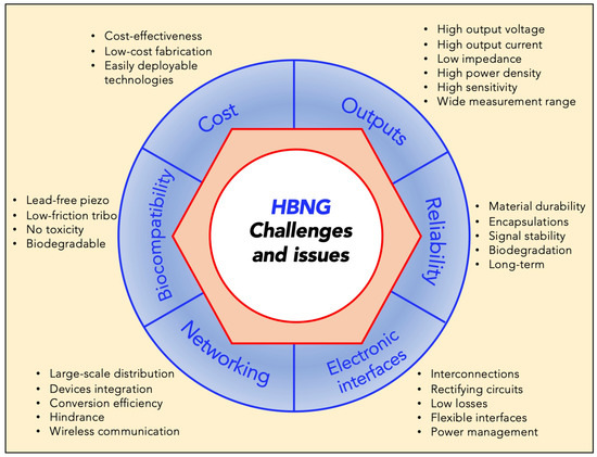 Definitely, the main practical issues related to wearable HBNGs are: high thicknesses, poor layer adhesion and delamination, non-optimal deformability and conformability, complex design, unproper choice of materials [76].