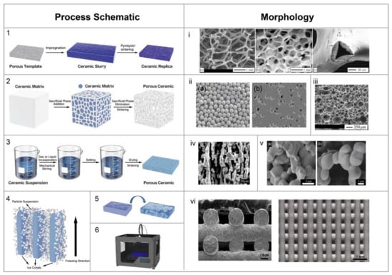 Schematic of processes and their corresponding morphologies: (1, i) replica template [], Reproduced with permission, Copyright 2006, Phil. Trans. R. Soc. A.; (2, ii) BURPS [], Reproduced with permission, Copyright 2007, J. Eur. Ceram. Soc.; (3, iii) Direct Foaming [], Reproduced with permission, Copyright 2010, J. Appl. Phys.; (4, iv) Freeze Casting [], Reproduced with permission, Copyright 2017, J. Mater. Chem. A Mater.; (5, v) Gel Casting [], Reproduced with permission, Copyright 2010, J. Appl. Phys.; (6, vi) Additive Manufacturing [], Reproduced with permission, Copyright 2018, J. Am. Ceram. Soc.