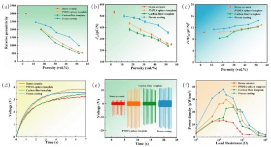 Among them, the Curie point of the material is closely related to stability and environmental adaptability. Compared with traditional dense piezoelectric ceramics, porous piezoelectric ceramics have a high fraction of secondary air phase. The presence of pores leads to porous ceramics exhibiting the characteristics of low density, low relative permittivity, low Young’s modulus, and low specific heat; the introduction of porosity also provide the ceramic with good thermal and sound insulation properties. Inevitably, as the porosity increases, the piezoelectric coefficient (such as d33) and pyroelectric coefficient (p) will decrease accordingly. However, some methods can be used to optimize the preparation process to greatly increase the polarization of the porous ceramic itself, thereby curbing this trend. As an example, this section summarizes the piezoelectric properties of multiple papers and lists them in Table 1, so that readers can understand the advantages of various porous piezoelectric ceramics concisely.