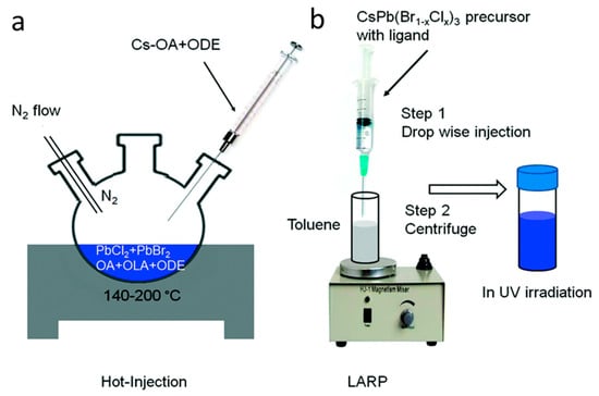 Schematic representation of CsPb(Cl, Br)3 NC synthesis using OAm and OA through (a) hot–injection and (b) the LARP method. Reprinted with permission from ref. [37] Copyright@ Royal Society of Chemistry.