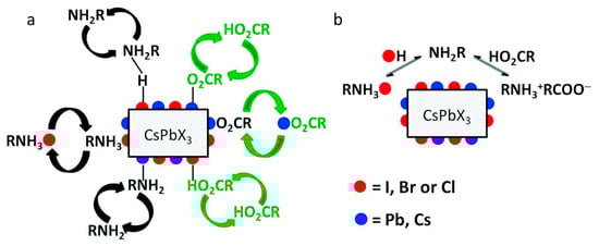 - Zaccaria, F.; Zhang, B.; Goldoni, L.; Imran, M.; Zito, J.; van Beek, B.; Lauciello, S.; De Trizio, L.; Manna, L.; Infante, I. The reactivity of CsPbBr3 nanocrystals toward acid/base ligands. ACS Nano 2022, 16, 1444–1455. [Google Scholar] [CrossRef]