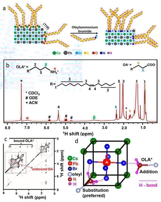 (a) Schematic diagram of the interaction of OAmBr with CsPbBr3 NCs. Reprinted with permission from ref. [59]; (b) 1H NMR spectrum and (c) Nuclear Overhauser effect spectrum (NOESY) of CsPbBr3 NCs dispersed in deuterated chloroform; and (d) Schematic diagram of possible binding modes of OAm+ via hydrogen bond. Reprinted with permission from ref. [55] Copyright 2017 American Chemical Society.