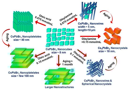 - Cho, J.; Banerjee, S. Ligand-directed stabilization of ternary phases: Synthetic control of structural dimensionality in solution-grown cesium lead bromide nanocrystals. Chem. Mater. 2018, 30, 6144–6155. [Google Scholar] [CrossRef]