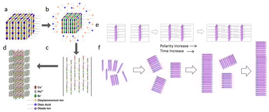 (a–d) Schematic representation of formation mechanism of one-dimensional OA/OAm-capped CsPbBr3 NC super-lattice nanostructures. Reprinted with permission from ref. [101] Copyright 2017 American Chemical Society. (e,f) Schematic representation of formation mechanism of long-range CsPbBr3 NPLs assembly in the presence of OA. Reprinted with permission from ref. [95] Copyright 2019 American Chemical Society.