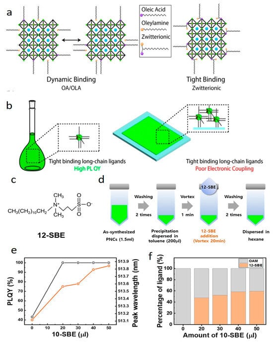 - Zhang, Y.; Hou, G.; Wu, Y.; Chen, M.; Dai, Y.; Liu, S.; Zhao, Q.; Lin, H.; Fang, J.; Jing, C.; et al. Surface reconstruction of CsPbBr3 nanocrystals by the ligand engineering approach for achieving high quantum yield and improved stability. Langmuir 2023, 39, 6222–6230. [Google Scholar] [CrossRef]