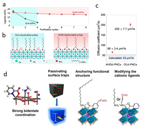 Other than these systems, several kinds of post-treatment approaches using a wide variety of compounds have been demonstrated to strip the native OA/OAm ligand pair and/or to passivate the surface defects of Cs LHP NCs [11,46,173]. These surface treatment processes impressively enhance the PLQY of Cs LHP NCs. All these findings clearly indicate the emergence of potential, alternative anchoring ligands for designing surface-tailored Cs LHP NCs by replacing the OA/OAm ligand pair. Figure 10 presents three key aspects: the surface ligand content of AHDA− and OA/OAm-capped CsPbI3 NCs with respect to purification cycles; a schematic illustration depicting the interaction of capping ligands with the surface of perovskite NCs; and diffusion coefficient values for OA/OAm- and AHDA-capped CsPbI3 NCs. Additionally, it shows the chemical structure and a schematic representation of picolinate capping on the surface of perovskite NCs.
