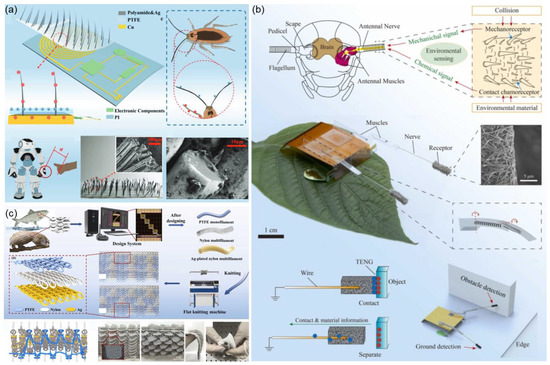 Inspired by the structure and function of insect antennae, Zhu et al. developed a self-powered bionic antenna (SBA) to enhance robotic tactile sensing (Figure 4b) [71]. This bionic sensor is particularly tailored for integration with micro-robots, which require sensors that are ultra-sensitive, lightweight, and capable of both passive and active real-time sensing. The SBA’s design is a testament to the effectiveness of biomimicry in engineering. It comprises a two-stage actuator, mimicking the movement of insect antennae, which allows for active sensing in both horizontal and vertical planes. This feature endows the SBA with a unique capability to actively interact with its environment, much like the multifunctional antennae of insects that detect mechanical, odor, temperature, and humidity changes. This component is sensitive to different contact materials, much like the diverse receptors found in insect flagellum. The bionic design also integrates muscle fibers, akin to those driving the antennae of insects, thus providing the SBA with the ability to move and sense in a manner similar to its natural counterparts. This biomimetic approach in the SBA design not only captures the structural essence of insect antennae but also successfully replicates their functional attributes, highlighting the potential of biomimicry in developing innovative solutions for robotic tactile systems.