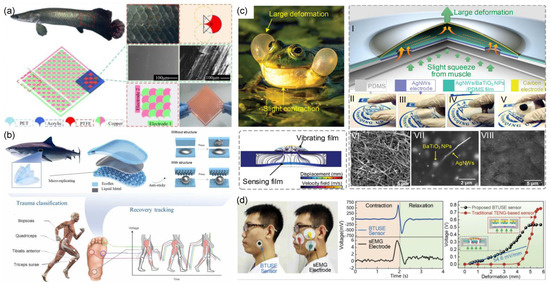 A wearable sensor for gait analysis is developed by Yeh et al., drawing inspiration from the unique microstructure of shark skin (Figure 5b) [30]. This biomimetic approach utilizes a solid–liquid TENG design, which incorporates a liquid metal encapsulated within a shark skin-like microstructure embedded on an Ecoflex surface. The key innovation lies in mimicking the hydrophobic and microstructured surface of shark skin, which significantly enhances the sensor’s performance in terms of sensitivity and long-term stability. The sensor’s design is grounded in the understanding of shark skin’s natural properties, notably its rib-like microstructure that reduces flow resistance and minimizes liquid adhesion. This feature is crucial for preventing liquid metal adhesion during the sensor’s operation, ensuring efficient signal monitoring and stability over prolonged use. The Ecoflex material, known for its flexibility and biocompatibility, is engineered to replicate the shark skin’s microstructure, achieving a surface that is not only hydrophobic but also capable of self-cleaning, much like the lotus leaf effect. This Bioinspired sensor operates on a self-powered mechanism. The combination of the liquid metal and the Ecoflex surface with a shark skin-like microstructure results in a high charge transfer capability, vital for precise gait analysis. The sensor’s efficacy is validated through a series of tests that demonstrate its ability to monitor various gait patterns, distinguishing between the walking patterns of healthy individuals and those with specific muscle injuries.