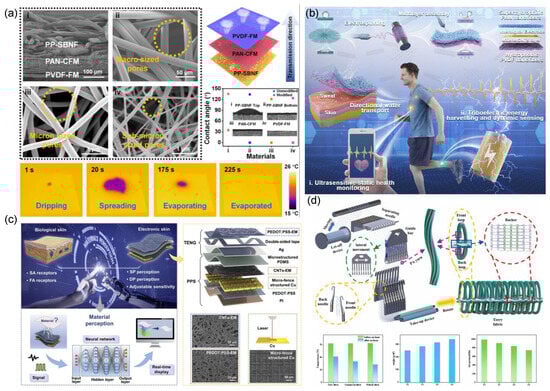 Zhi et al. focuses on the development of a bioinspired directional moisture-wicking e-skin (DMWES), leveraging the principles of heterogeneous fibrous membranes and electrospun conductive layers (Figure 7b) [11]. The DMWES is designed to efficiently manage moisture, particularly sweat, through a unidirectional transfer mechanism, ensuring stable bioelectrical signal acquisition. The DMWES is constructed in a multilayered approach. The base layer consists of hydrophobic carboxylic carbon nanotube (CNT) modified polyvinylidene fluoride (C-PVDF) nanofibers, created through an electrospinning process. This layer serves as the contact interface with the skin, characterized by its low sweat absorption and minimal wetting area. The hydrophobic C-PVDF layer provides a barrier that only allows moisture transfer when a threshold is reached, at which point moisture is drawn into the superhydrophilic PAN layer.