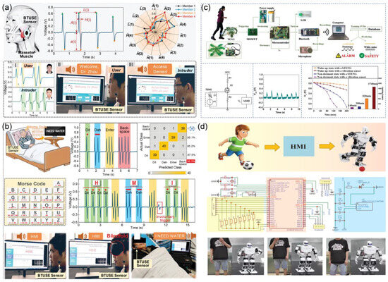 Zhou et al. presents a groundbreaking development in human–machine interface (HMI) technology, particularly for assisting people with disabilities in communication (Figure 11a) [59]. Inspired by frogs’ croaking behavior, the researchers developed a bionic TENG-based ultra-sensitive self-powered electromechanical (BTUSE) sensor. This sensor is capable of converting the micromotion of muscles, specifically the masseter muscle, into electrical signals for HMI control. A novel aspect of this research is the integration of machine learning algorithms and Morse code to achieve a reliable, safe, and accurate (96.3%) communication aid for disabled users. The BTUSE sensor’s advanced capabilities enable the translation of subtle muscle movements into distinct Morse code signals, which are then interpreted by the system to facilitate communication. The system’s intelligent control is further exemplified in an authentication system, where the sensor’s signals, representing muscle movements, are analyzed and recognized through software platforms using support vector machine (SVM) algorithms and principal component analysis (PCA). This allows for secure and personalized access to the communication system, enhancing user privacy and security. In practical applications, the BTUSE sensor’s exceptional sensitivity and range make it particularly useful for disabled individuals who have limited communication abilities. For instance, the hands-free typing communication system developed in this study empowers users to communicate complex messages, including letters and sentences, by simple muscle movements (Figure 11b).
