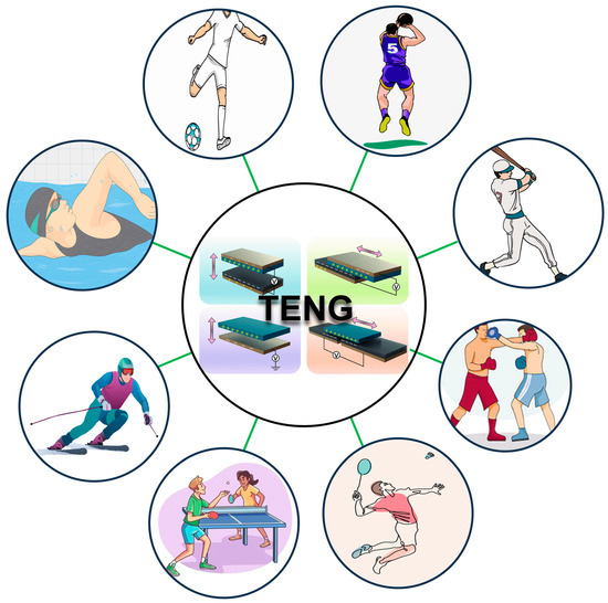 In today’s rapidly evolving society, where digital integration and sustainability are paramount, triboelectric nanogenerators (TENGs) embody a remarkable fusion of innovation and practicality, particularly within the sphere of intelligent sports [1,2,3,4,5]. With the continuous advancements occurring with the internet, big data, and artificial intelligence, the sophistication and complexity of smart technologies are becoming increasingly prominent considerations that have come to permeate various industries [6,7,8,9]. Particularly since the COVID-19 pandemic, there has been a heightened focus on personal health management, with sports monitoring aligning with the broader trend toward digitization. The era of sports today is more data-driven than ever, as it encompasses not only the monitoring of physical activity but also assessments of sports posture and proactive protection during activities, all of which are crucial for understanding and improving health conditions, enhancing physical fitness, and planning targeted training [10,11,12,13,14].