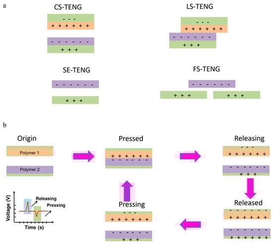 Working principle of TENG. (a) Four working principles of TENG. (b) The working principle of the TENG in contact-separation mode.